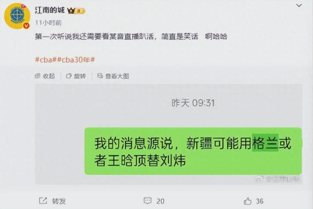 据媒体人“江南的城”透露,新疆男篮目前有两个选择,外教格兰,本土教练王晗。