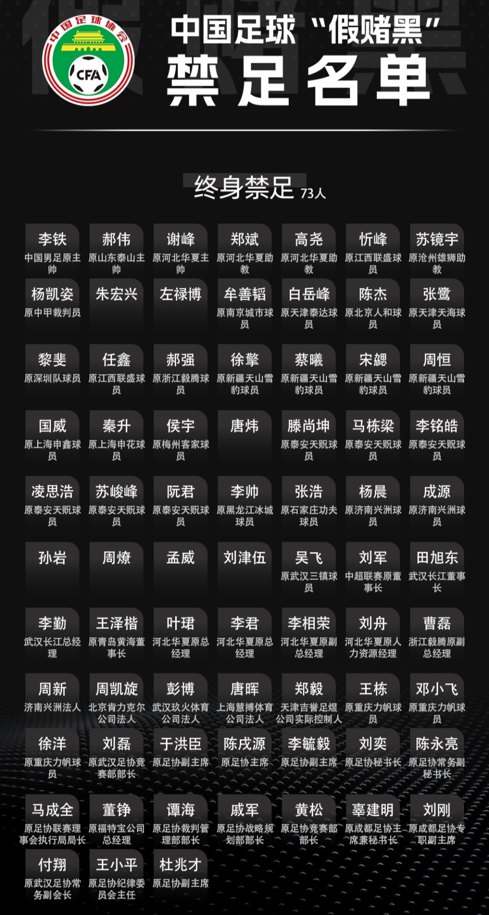 今年1月29日,足协又公布了第2批涉案人员的处罚,76人被罚,陈戌源、杜兆才、李铁、王小平、郝伟、张鹭、秦升等73人终身禁足。
