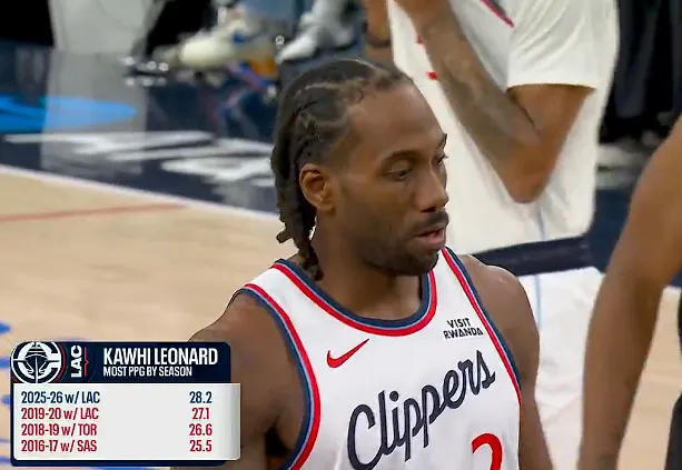 第三节比赛中,转播方列出数据,伦纳德本赛季场均28.2分生涯新高,此前最高19-20赛季27.1分;