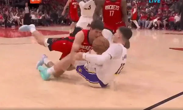 第三节比赛中,谢泼德倒地抢断拉拉维亚,伊森反击暴扣领先22分打停湖人。